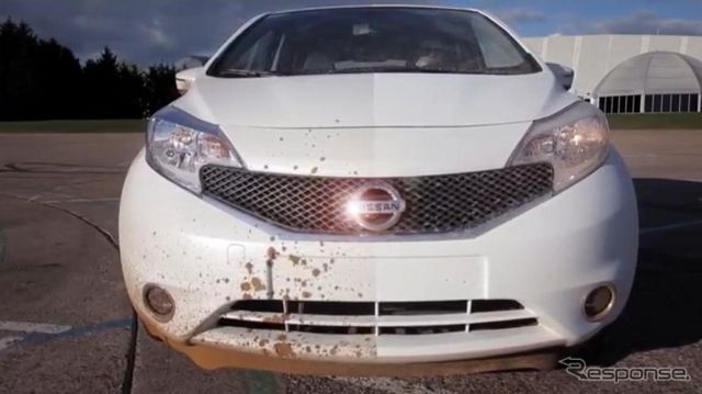 日産自動車の欧州法人、欧州日産が発表した車体にセルフクリーニング機能を備えた『ノート』のプロトタイプ車。同車の映像がネット上で公開され、再生回数が450万回を超えている。