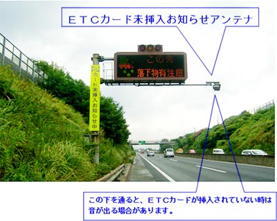 ETCゲートのおよそ50m手前で警告メッセージが流れるが