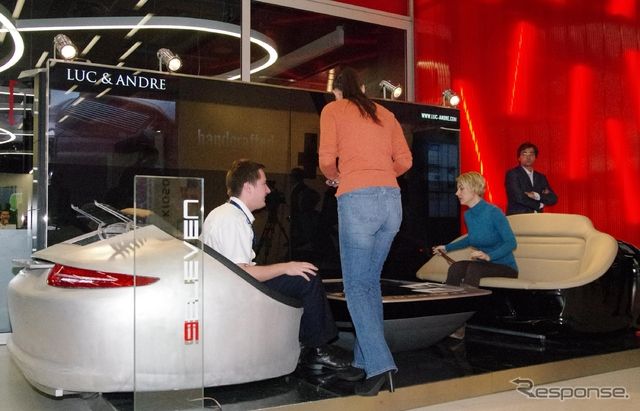 会場には実際に座ることができる2つのソファ911を展示した。テールレンズは本物の997型911のものを採用しているが、それ以外は全てお手製。ブラックのソファが強化プラスチック製、シルバーのソファがオールアルミ製だ。この他カーボンもラインアップするという。「911の曲面をソファで再現できるのはウチくらいだよ」と、展示担当者。
